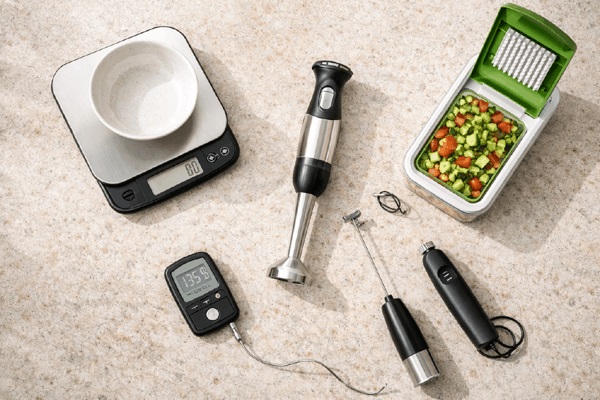 The digital food scale is probably the most underrated. It is inexpensive, compact, and surprisingly useful for baking, meal prep, and consistency.
