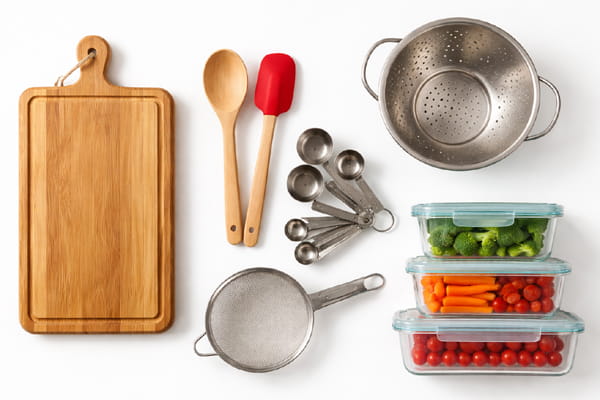 Stick with simple, versatile tools that are easy to use and hard to outgrow. Measuring tools, cutting boards, bowls, spatulas, and storage containers are strong first choices.