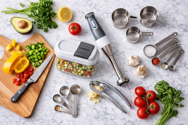 For beginners, the best starting points are measuring cups and spoons, a vegetable chopper, a digital kitchen scale, and a hand blender. These tools are practical, easy to use, and helpful for a wide range of meals.
